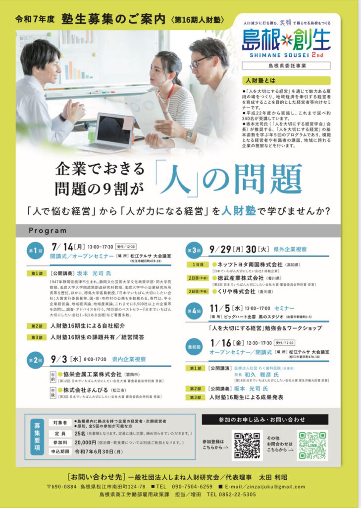 第16期人財塾募集開始 2025 5/22 お知らせ しまね人財塾 お知らせ よかったらシェアしてね! URLをコピーしました! URLをコピーしました! 山陰経済ウイークリー220531号 第16期人財塾事前説明会 この記事を書いた人 しまね人財塾 しまね人財塾は、社員や地域の人々から「いい会社だね!」と言ってもらえる企業を目指す経営者のための学びの場。過去の受講者のうち、11社が「日本で一番大切にしたい会社」大賞を受賞 関連記事 第16期人財塾事前説明会 2025年5月22日
